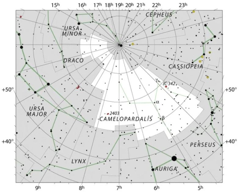기린자리 별자리는 북반구에 있습니다. 그 이름은 "기린"에 대한 그리스어 단어의 라틴어 파생에서 비롯됩니다.카멜로파르달리스 라는 단어는 분리하면 낙타(그리스어로 kamēlos )와 표범( pardalis )을 의미합니다. 기린은 낙타처럼 긴 목과 표범처럼 반점이 있는 몸을 가지고 있었기 때문에 "낙타 표범"이라고 불렸습니다. 이 별자리는 네덜란드 천문학자 Petrus Plancius에 의해 만들어졌고 1624년 독일 천문학자 Jakob Bartsch에 의해 기록되었습니다. 여기에는 상대적으로 희미한 별들의 폭포수와 몇가지 주목할만한 깊은 천체에 의해 형성된 별자리가 포함되어 있습니다.